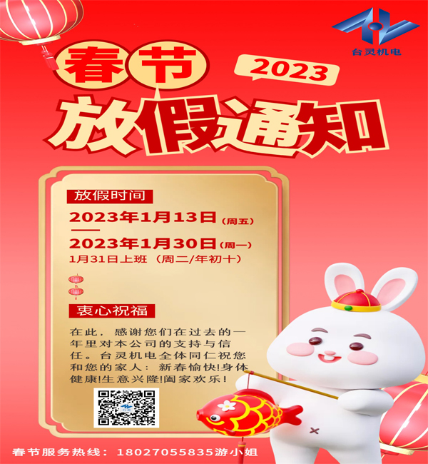 感謝廣大用戶對臺靈一直以來的鼎力支持,春節(jié)將至,臺靈所有員工在此祝大家新春大吉,萬事如意!2023年春節(jié)假期安排如下,如有需要,可聯(lián)系下方客服熱線,由此給大家?guī)淼牟槐?,深感歉意?/span>